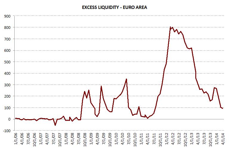 The issues Mario Draghi has harped on repeatedly this year are a prolonged period of low inflation and an unwarranted rise in money market rates. Overnight money market rates have been on the rise over the past two weeks as seen below. This rise in overnight lending is especially harmful to periphery banks that are more likely to be funding themselves on a short overnight basis. As banks repay LTRO loans, excess liquidity in the Eurosystem has fallen below the important psychological mark of 100bn.