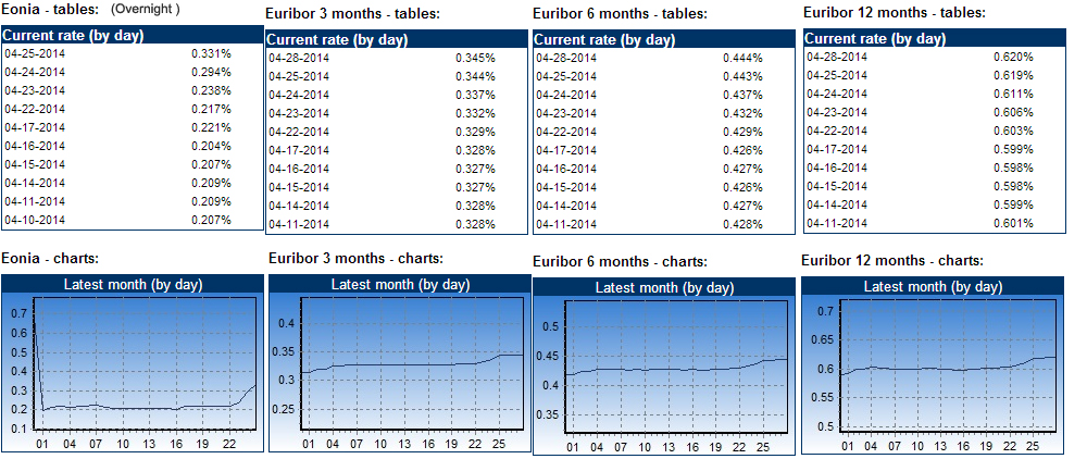 EONIA(overnight lending rate) has fixed above the ECB’s overnight cash rate of 0.25% several times in the past week, which represents a clear malfunction in transmission of the ECB’s policy. Mr.Draghi also likes to pat himself on the back for the ECB’s genius forward guidance not allowing short tenor money market volatility to propagate down the interest rate curve to the 1 year rate. I am guessing that self congratulating session won’t be going on at next week’s meeting as for the first time in months longer tenor Euribor rates are starting to tick up. 3 ,6 and 12 month rates have been on the rise during the last 2 weeks of the entire curve moving higher, lead by sharp moves up in EONIA. See the graph below: