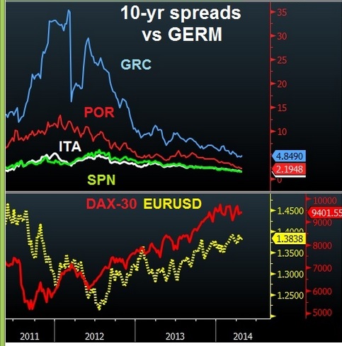 Market pundits seem to believe that Draghi’s July 2012 promise to do “Whatever it Takes to save the Euro” was the catalyst that fixed the Euro crisis. It is debatable whether Draghi actually fixed anything, even though he loves to pat himself on the back for saving the day. Nearly 3 trillion dollars in monetary expansion has been undertaken by the Fed, BOJ and PBoC over the last 18 months that stormed into Eurozone bond markets and sparked a massive rally in periphery debt. Relative to US government bonds, there is not much value left in periphery debt and these assets could already be fairly valued.