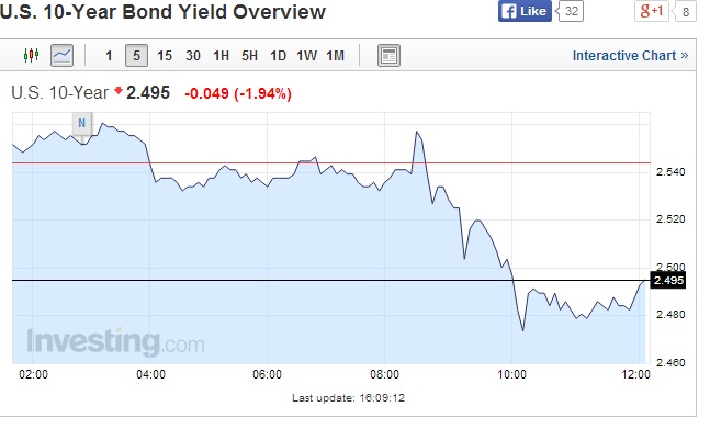 Periphery bonds and EM Currencies began a slide that took 10 year Spanish and Italian yields back above 3%, meanwhile US and German yields dropped to recent lows as the 10 year Bond yield dropped below 2.50% where stop loss orders were triggered and the yield dropped to a low of 2.47%. The net effect is a significant widening of periphery yields over German and US bonds. Credit spreads are blowing out for the first time in a long time.